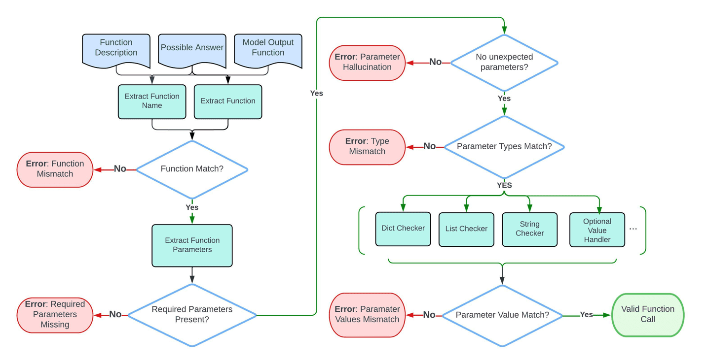 We use abstract syntax tree (AST) to evaluate the function calling performance. AST parses the generated function call and performs fine-grained evaluation on the correctness of the generated function name, parameter values, and data types with the following workflow: