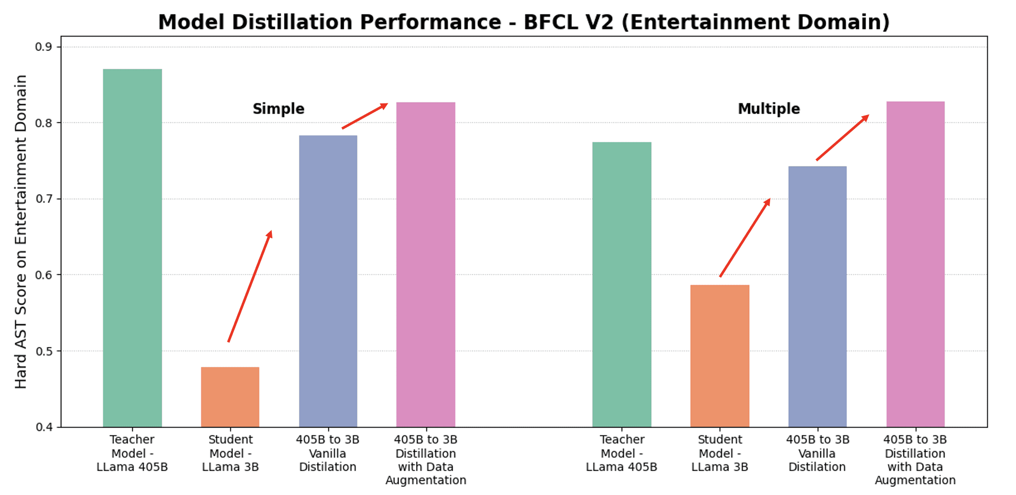 Applying data augmentation techniques provided further gains beyond vanilla distillation. In the simple category, performance improved from 0.783 to 0.826, and in the multiple category, from 0.742 to 0.828. On average, this resulted in a 5.8% relative improvement across both categories, calculated as the mean of the relative gains in each. These results highlight the effectiveness of both distillation and augmentation strategies in enhancing student model performance for function call tasks.