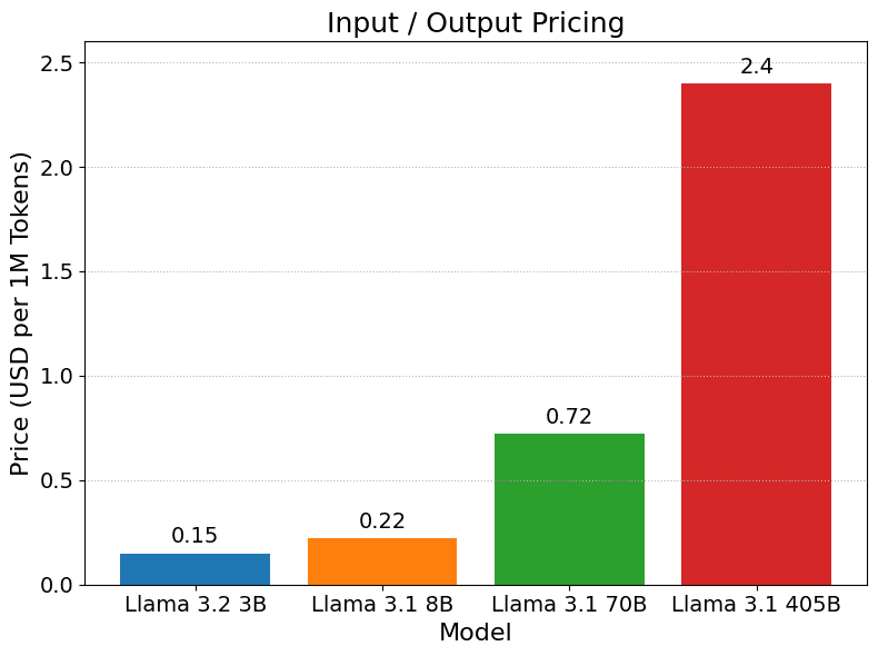 In addition, we report the comparison of cost per 1M tokens for different Llama models. As shown in the following figure, it’s evident that smaller models (Llama 3.2 3B and Llama 3.1 8B) are significantly more cost-effective. As the model size increases (Llama 3.1 70B and Llama 3.1 405B), the pricing scales steeply. This dramatic increase underscores the trade-off between model complexity and operational cost.