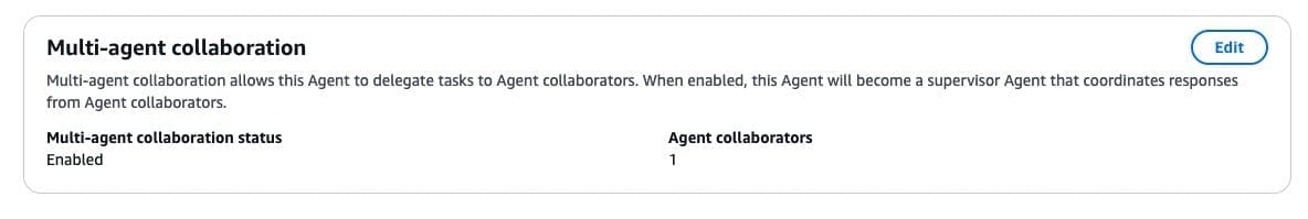 In the Multi-agent collaboration section, choose Edit. Add the knowledge base agent as a supervisor-only collaborator, without including routing configurations.