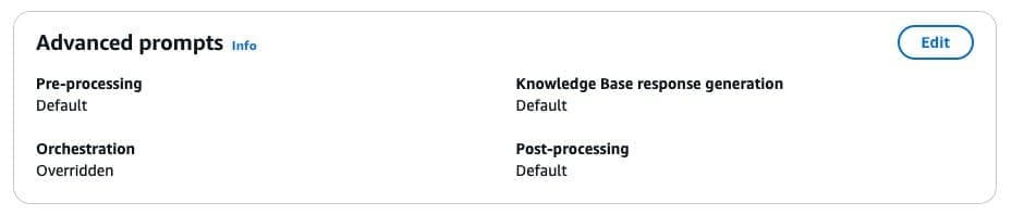 To verify proper orchestration of our specified schema, we’ll leverage the advanced prompts feature of the agents. This approach is necessary because our action group adheres to a specific schema, and we need to provide seamless agent orchestration while minimizing hallucination caused by default parameters. Through the implementation of prompt engineering techniques, such as chain of thought prompting (CoT), we can effectively control the agent’s behavior and make sure it follows our designed orchestration pattern.