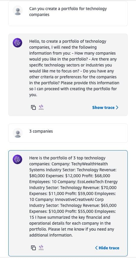 If you’re interested in learning more about the underlying mechanisms, you can choose Show trace, to observe the specifics of each stage of the agent orchestration.