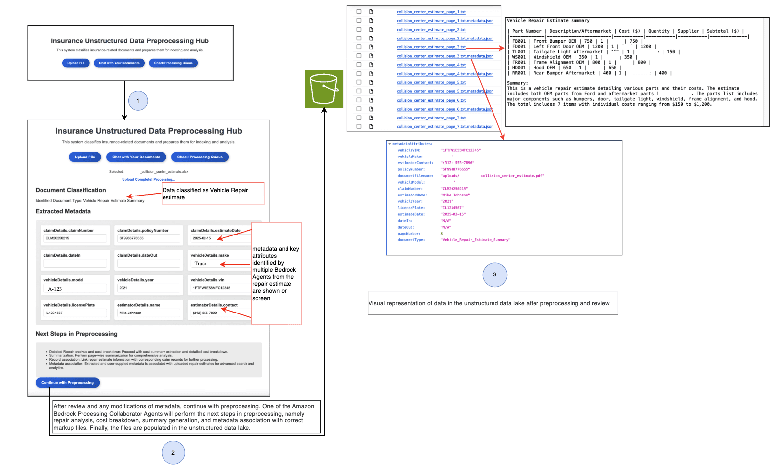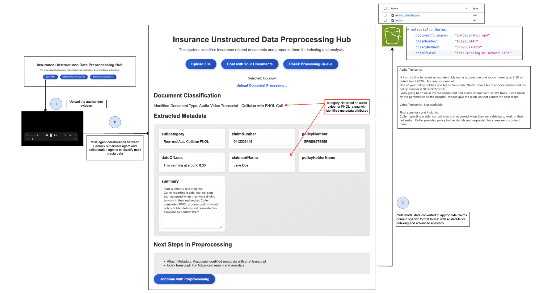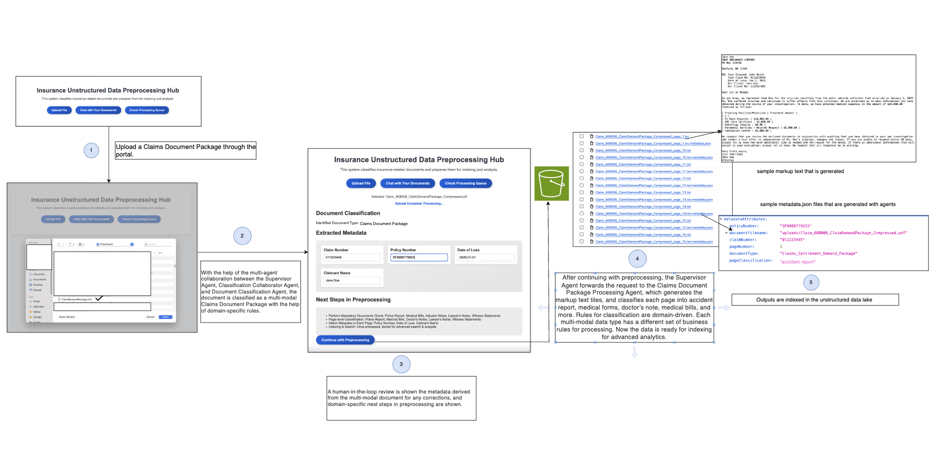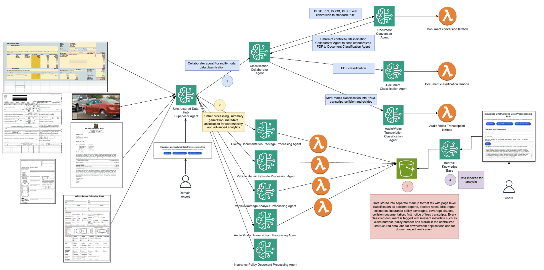 Traditional data preprocessing methods, though functional, might have limitations in accuracy and consistency. This might affect metadata extraction completeness, workflow velocity, and the extent of data utilization for AI-driven insights (such as fraud detection or risk analysis). To address these challenges, this post introduces a multi‐agent collaboration pipeline: a set of specialized agents for classification, conversion, metadata extraction, and domain‐specific tasks. By orchestrating these agents, you can automate the ingestion and transformation of a wide range of multimodal unstructured data—boosting accuracy and enabling end‐to‐end insights.