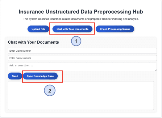 - After the sync is complete (which might take a couple of minutes), enter your queries in the text box. For example, set Policy Number to SF9988776655 and try asking: