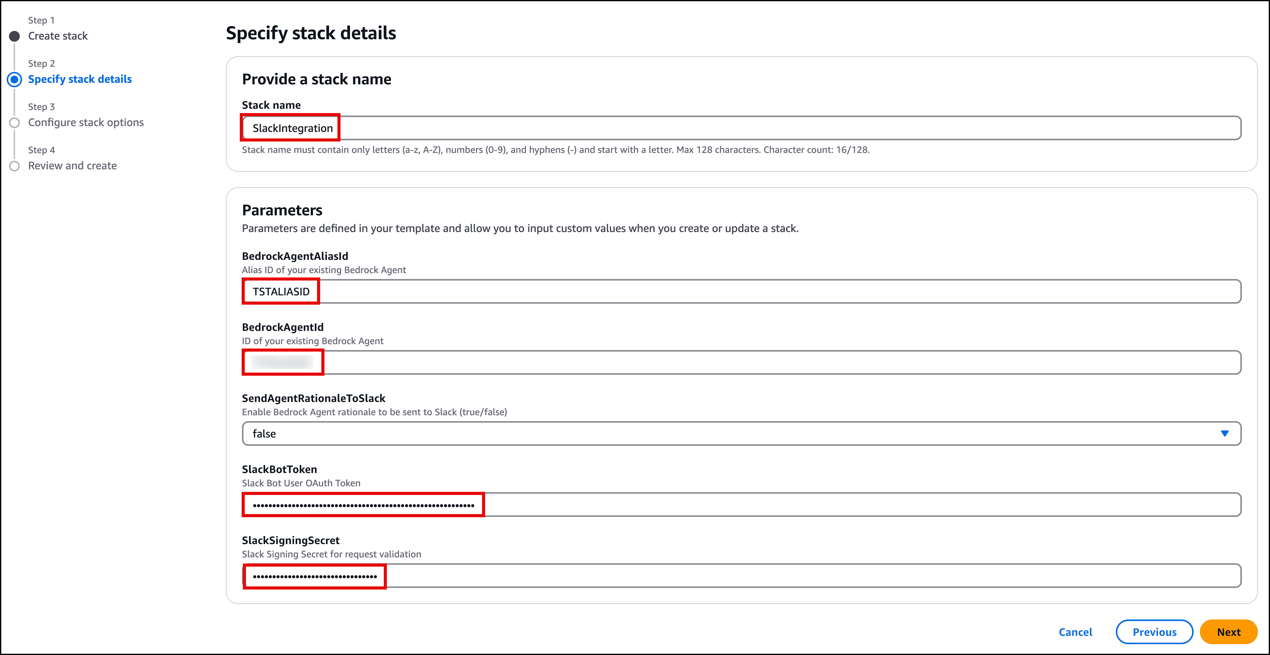 Provide your preferred stack name. When deploying the CloudFormation template, you’ll need to provide four values: the Slack bot user OAuth token, the signing secret from your Slack configuration, and the BedrockAgentId and BedrockAgentAliasID values saved earlier. If your agent is in draft version, use TSTALIASID as the BedrockAgentAliasID. Although our example uses a draft version, you can use the alias ID of your published version if you’ve already published your agent.