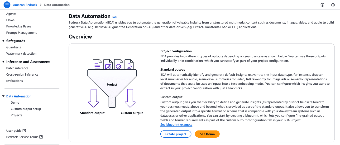 - To create a blueprint, on the Amazon Bedrock Data Automation console in the navigation pane under Data Automation, select custom output.