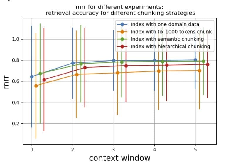 For reference, a paragraph of approximately 1,000 characters typically translates to around 200 tokens. To assess performance, we measured document relevance and MRR across different context sizes, ranging from 1–5. This comparison aims to provide insights into the most effective chunking strategy for organizing and retrieving information for this use case.The following figures illustrate the MRR and document relevance metrics, respectively.