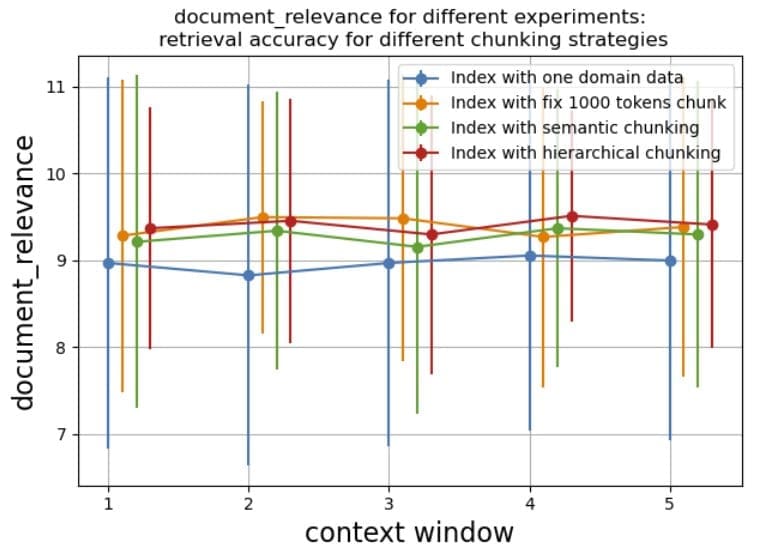 These metrics provide complementary insights: document relevance offers a content-based assessment, and MRR provides a ranking-based evaluation. Together, they offer a comprehensive view of the retrieval system’s effectiveness in finding and prioritizing relevant information.In our recent experiments, we explored various data chunking strategies to optimize the performance of retrieval. We tested several approaches, including fixed-size chunking as well as more advanced semantic chunking and hierarchical chunking.Semantic chunking focuses on preserving the contextual relationships within the data by segmenting it based on semantic meaning. This approach aims to improve the relevance and coherence of retrieved results.Hierarchical chunking organizes data into a hierarchical parent-child structure, allowing for more granular and efficient retrieval based on the inherent relationships within your data.