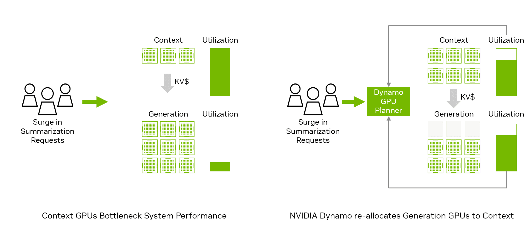 This dynamic optimization makes sure GPU resources are allocated efficiently across prefill and decode tasks without requiring system downtime. By considering application SLOs (like Time To First Token and Inter-Token Latency) and the costs of KV Cache transfer, the NVIDIA Dynamo Planner makes informed decisions to reallocate GPUs or change serving strategy to alleviate bottlenecks and adapt to further workload shifts. This adaptability allows the system to maintain optimal throughput, handle demand spikes effectively, and deliver peak performance across large-scale distributed deployments.