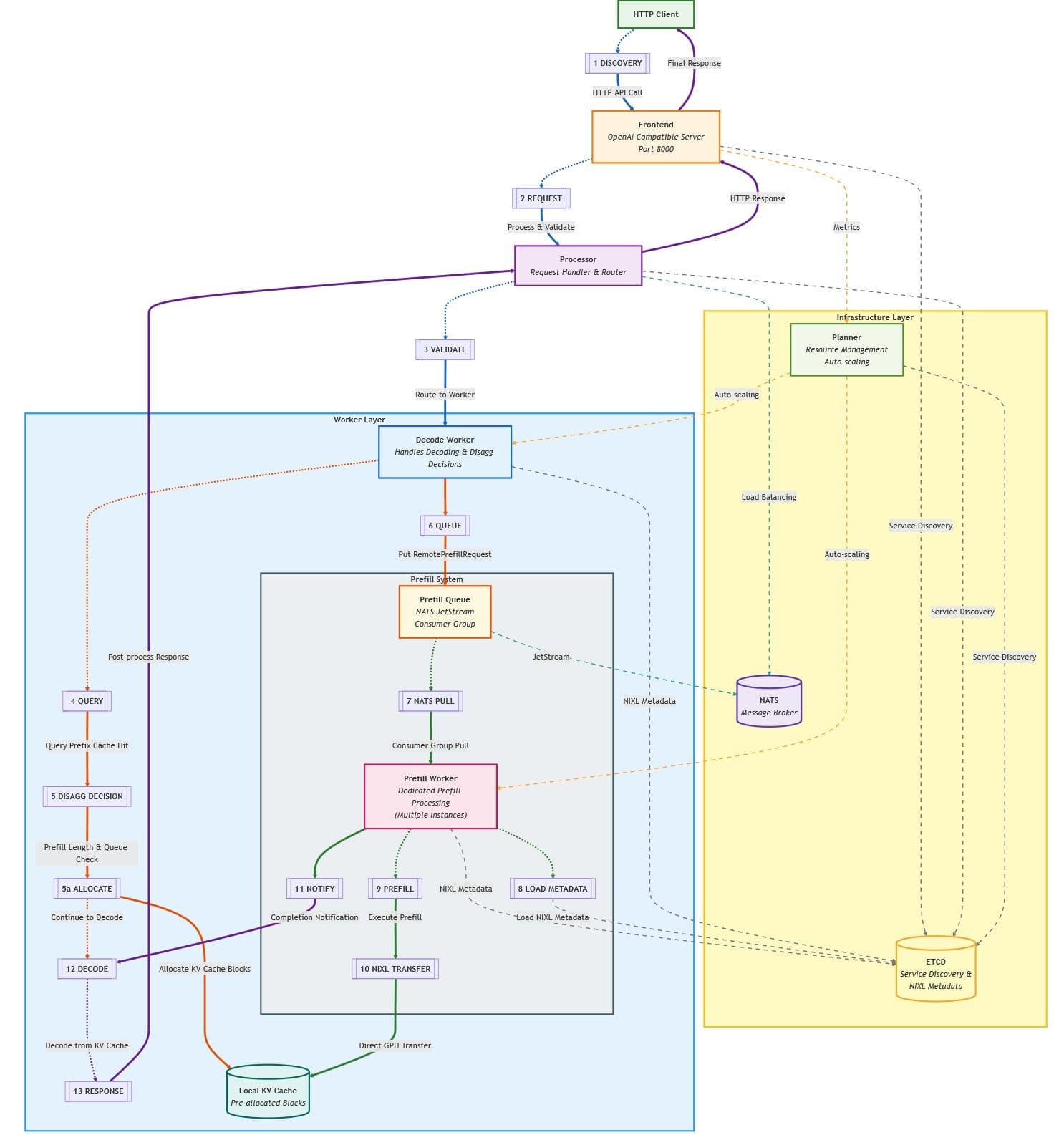 This diagram shows the decode to prefill flow, but NVIDIA Dynamo also supports the prefill to decode flow. Refer to the NVIDIA Dynamo documentation to dive deeper into the lifecycle of a request under disaggregated inference.