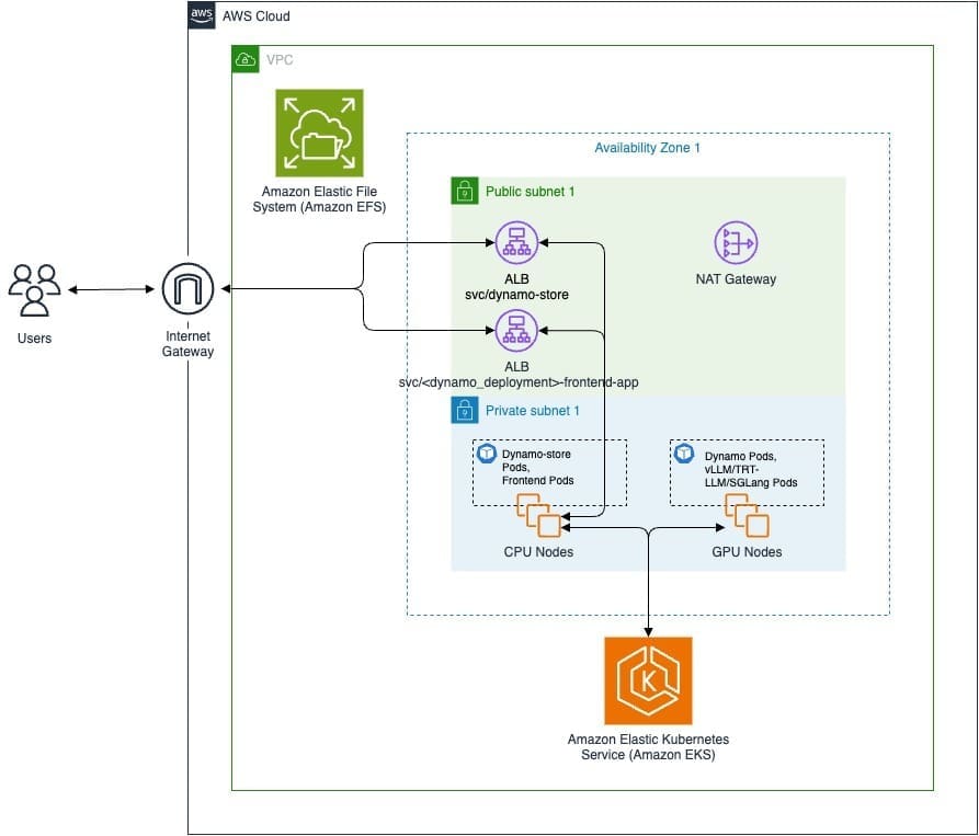 This architecture enables efficient distributed inference by separating the token parallel prefill phase from the latency-sensitive decode phase, while achieving high throughput through zero-copy GPU transfers and intelligent resource management. Running inference in production isn’t just about performance—you need logging, monitoring, security, and more. Therefore, NVIDIA Dynamo on AWS infrastructure is an attractive option for customers to use self-managed AI/ML services, Amazon Elastic File System (Amazon EFS) or Amazon FSx for Lustre for model storage, Network Load Balancer for access, Amazon CloudWatch or Prometheus for observability, AWS Identity and Access Management IAM and virtual private cloud (VPC) isolation and security groups for security, and EFA for low-latency inter-node communication (critical for prefill and decode disaggregation).