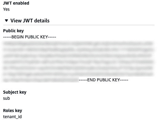 The JWT payload includes a tenant_id attribute as follows:"tenant_id": "tenant-a" Tenant users and FGAC roles are linked by setting this attribute as the roles key in OpenSearch JWT authentication and mapping roles as follows: