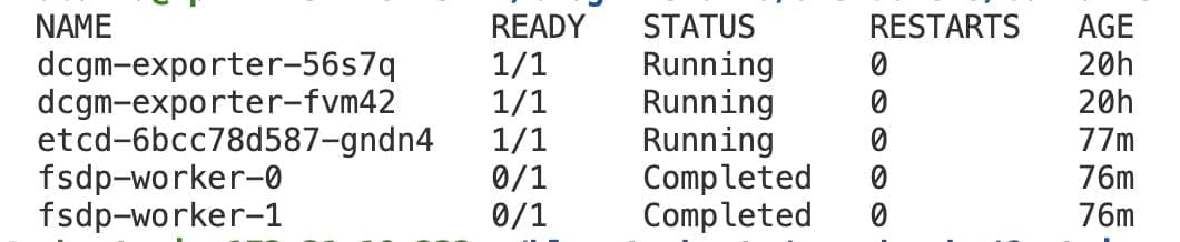 For our use case, the job took 1.5 hours to complete. The script uses the following PyTorch command that’s defined in the .env file within the fsdp folder: