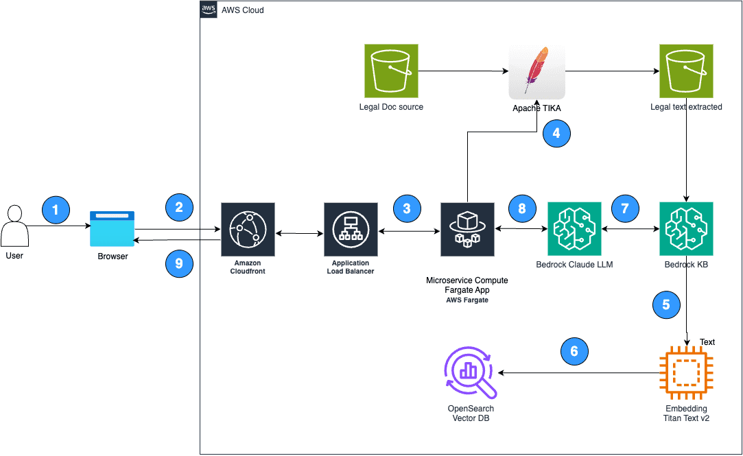 - Document handling: Legal documents are stored in an Amazon Simple Storage Service (Amazon S3) bucket, and Apache Tika extracts text from these documents. The extracted text is stored as individual text files in a separate S3 bucket. This bucket is used as the source repository for Amazon Bedrock.