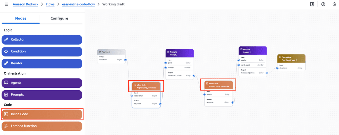 Inline code nodes now supported in Amazon Bedrock Flows in public preview