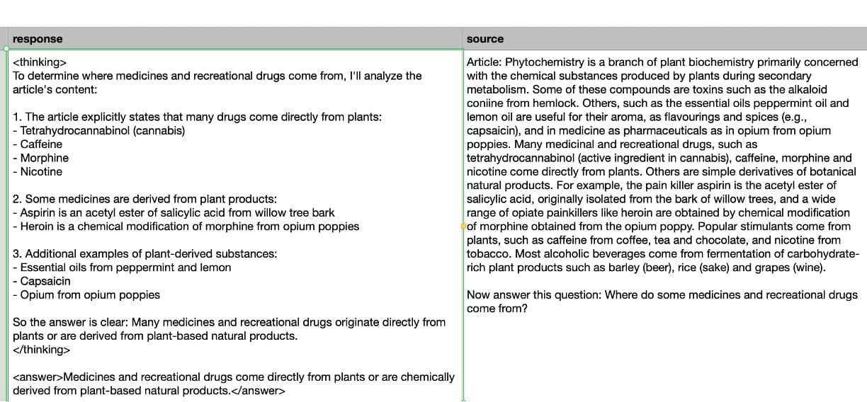The question_answering prompt template in prompt_templates.py has a formatting key called source to match the name of the appropriate column in the referenced dataset (see the preceding example). We use this prompt to generate the rationale and answer for each of the 2.2 million rows in the dataset. See the following code: