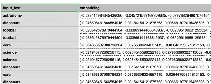 For embedding models, the output (list of floats) will be in a new column called embedding, as shown in the following screenshot.