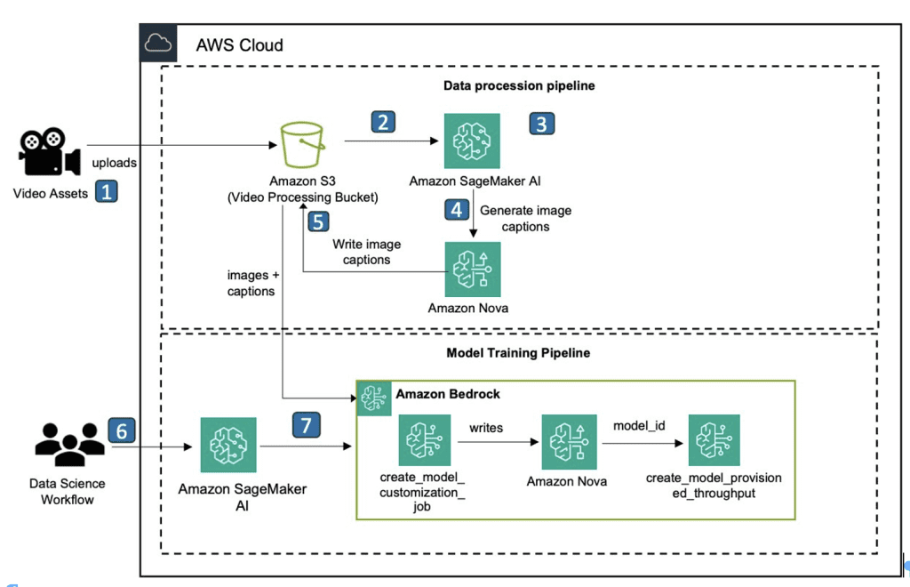 This workflow is structured in two distinct phases. The initial phase, in Steps 1–5, focuses on preparing the training data. In this post, we walk through an automated pipeline to extract images from an input video and then generate labeled training data. The second phase, in Steps 6–7, focuses on fine-tuning the Amazon Nova Canvas model and performing test inference using the custom-trained model. For these latter steps, we provide the preprocessed image data and comprehensive example code in the following GitHub repository to guide you through the process.