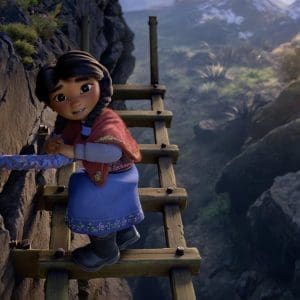 | Mayu face shows a mix of nervousness and determination. Mommy kneels beside her, gently holder her. A landscape is visible in the background. | A steep cliff face with a long wooden ladder extending downwards. Halfway down the ladder is Mayu with a determined expression on her face. Mayu’s small hands grip the sides of the ladder tightly as she carefully places her feet on each rung. The surrounding environment shows a rugged, mountainous landscape. | Mayu standing proudly at the entrance of a simple school building. Her face beams with a wide smile, expressing pride and accomplishment. |