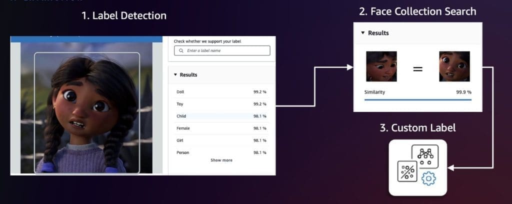 We recommend first sampling video frames at fixed intervals (for example, 1 frame per second). Then, apply Amazon Rekognition label detection and face collection search to identify frames and characters of interest. Label detection can identify over 2,000 unique labels and locate their positions within frames, making it ideal for initial detection of general character categories or non-human characters. To distinguish between different characters, we then use the Amazon Rekognition feature to search faces in a collection. This feature identifies and tracks characters by matching their faces against a pre-populated face collection. If these two approaches aren’t precise enough, we can use Amazon Rekognition Custom Labels to train a custom model for detecting specific characters. The following diagram illustrates this workflow.