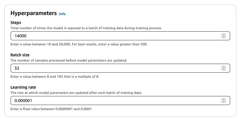 This hyperparameter combination yielded good results during our experimentation. In general, increasing the learning rate makes the model train more aggressively, which often presents an interesting trade-off: we might achieve character consistency more quickly, but it might impact overall image quality. We recommend a systematic approach to adjusting hyperparameters. Start with the suggested batch size and learning rate, and try increasing or decreasing the number of training steps first. If the model struggles to learn your dataset even after 20,000 steps (the maximum allowed in Amazon Bedrock), then we suggest either increasing the batch size or adjusting the learning rate upward. These adjustments, through subtle, can make a significant difference in our model’s performance. For more details about the hyperparameters, refer to Hyperparameters for Creative Content Generation models.
