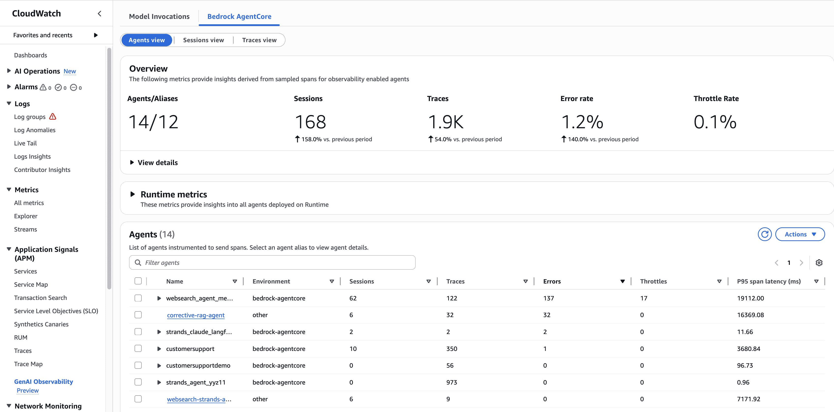 With this configuration, your observability data flows into CloudWatch, where you can view it through the GenAI Observability dashboard, providing visibility into your agent’s behavior from high-level metrics down to individual trace details.