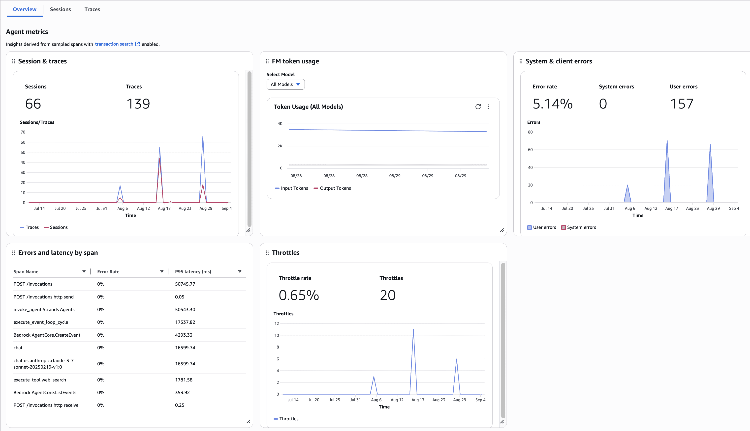 The following screenshot dives into a single agent, highlighting the sessions, traces, latency, errors, and throttles specific to an agent with related visualization graphs.