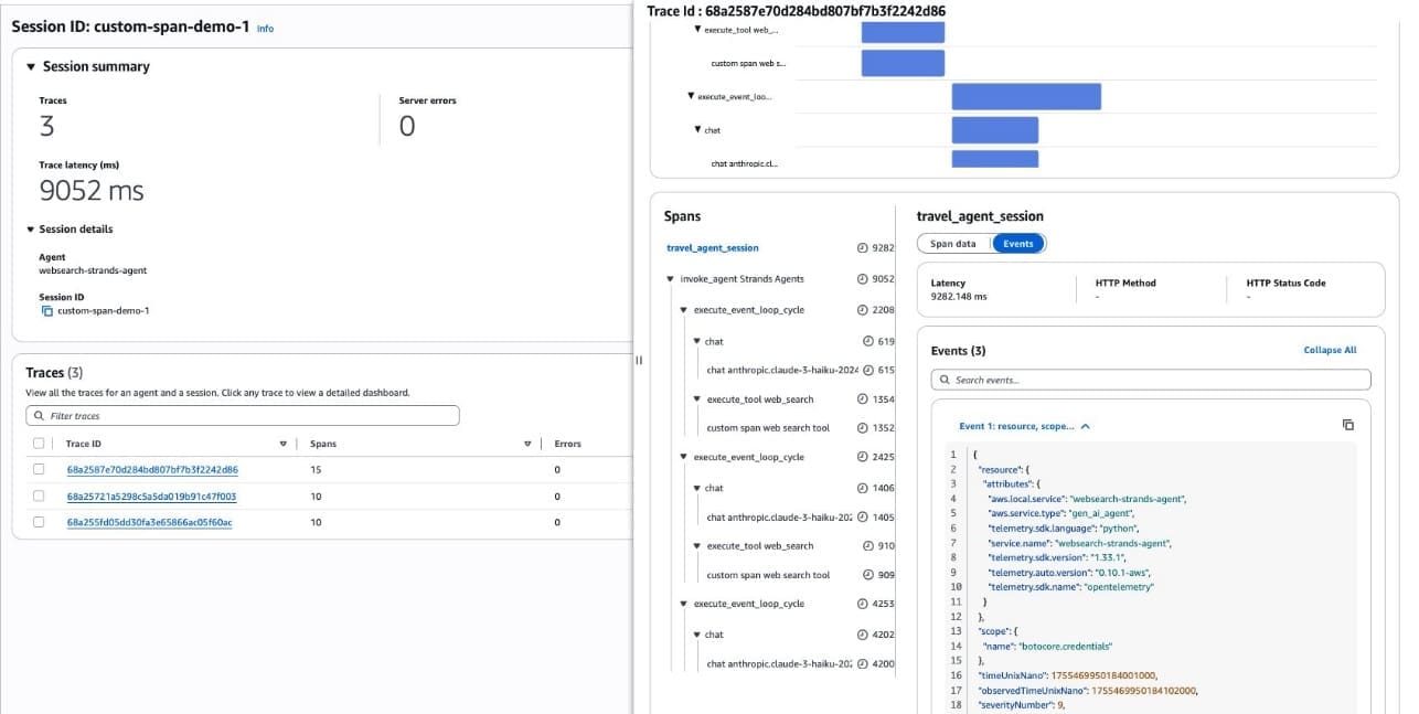 These custom attributes flow through your entire trace, enabling powerful queries in CloudWatch such as “show me all premium user sessions with latency over 2 seconds” or “compare performance between experiment versions.” This metadata becomes invaluable for offline evaluations, A/B testing, and performance optimization.