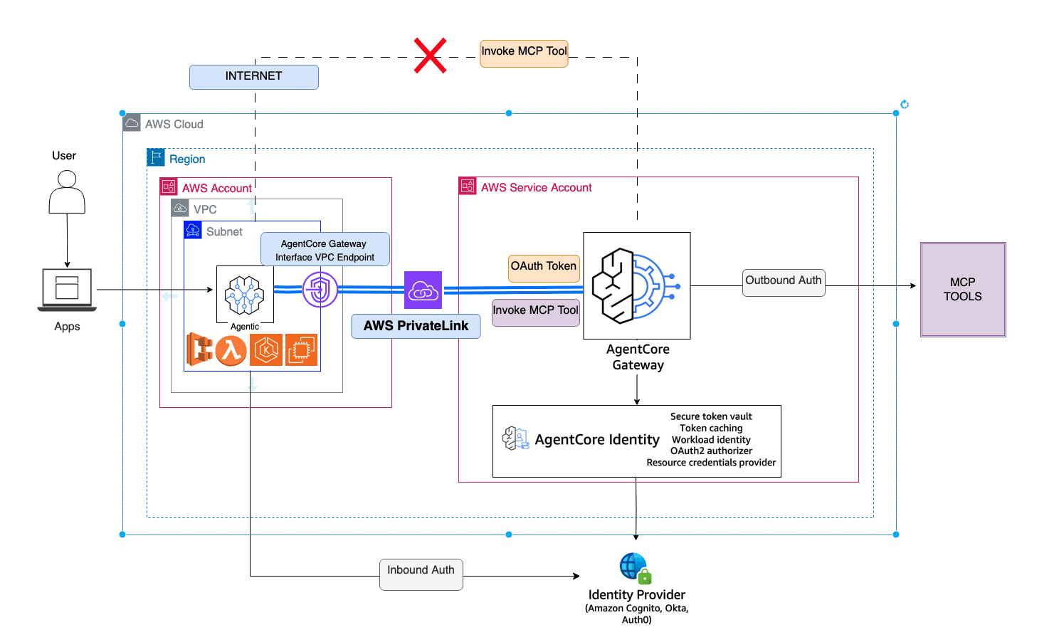 - Private and public network communication – The interface VPC endpoint enables secure communication for inbound traffic from agents to AgentCore Gateway through AWS PrivateLink, making sure this traffic remains within the private network. However, authentication workflows—including OAuth access token retrieval and credential exchange processes between agents and external Identity Provider systems for both inbound and outbound flows—and outbound access from the gateway to MCP tools continue to require internet connectivity for establishing secure sessions with identity systems and external resources hosted outside the AWS environment.