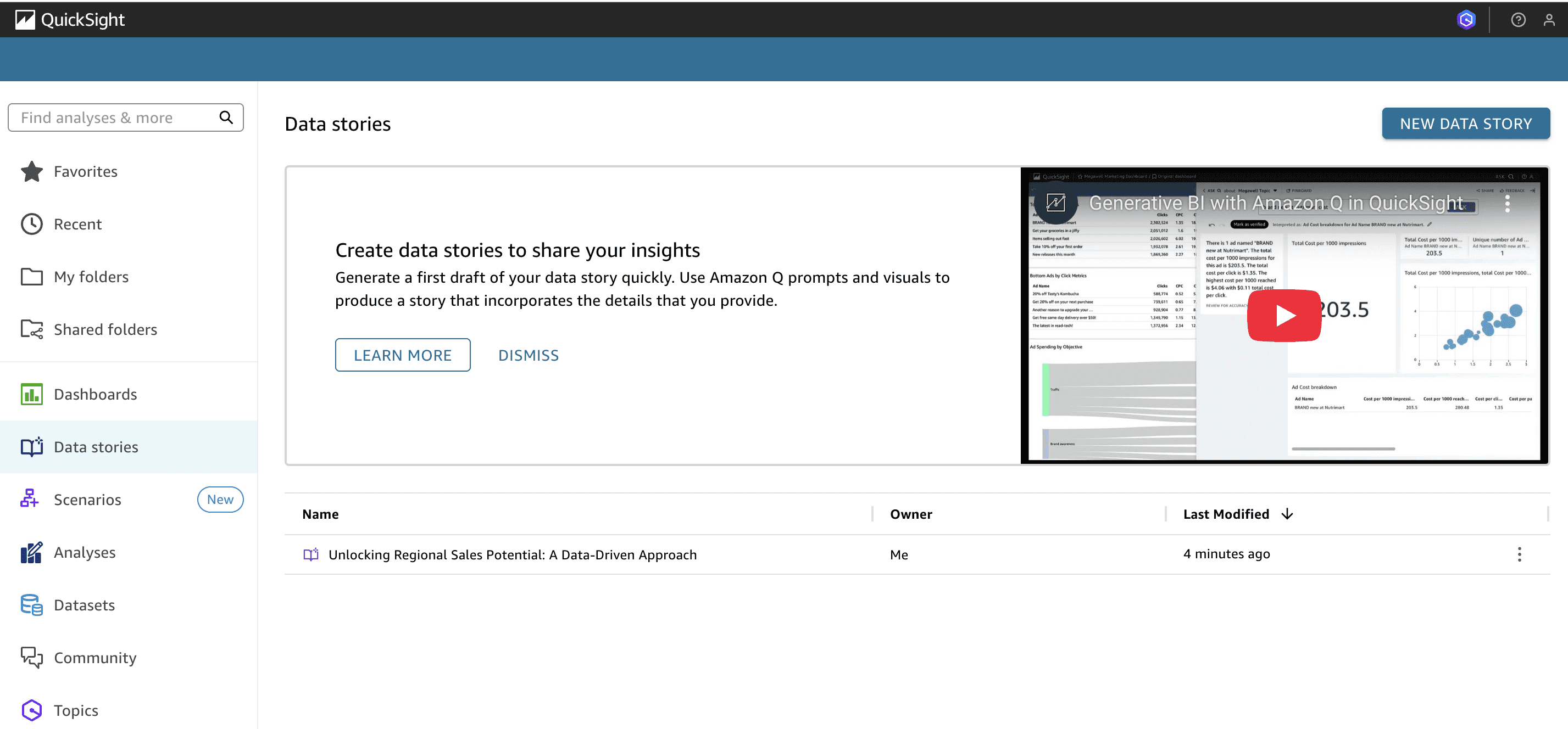 - A published QuickSight dashboard containing the visuals required for your QuickSight data story.