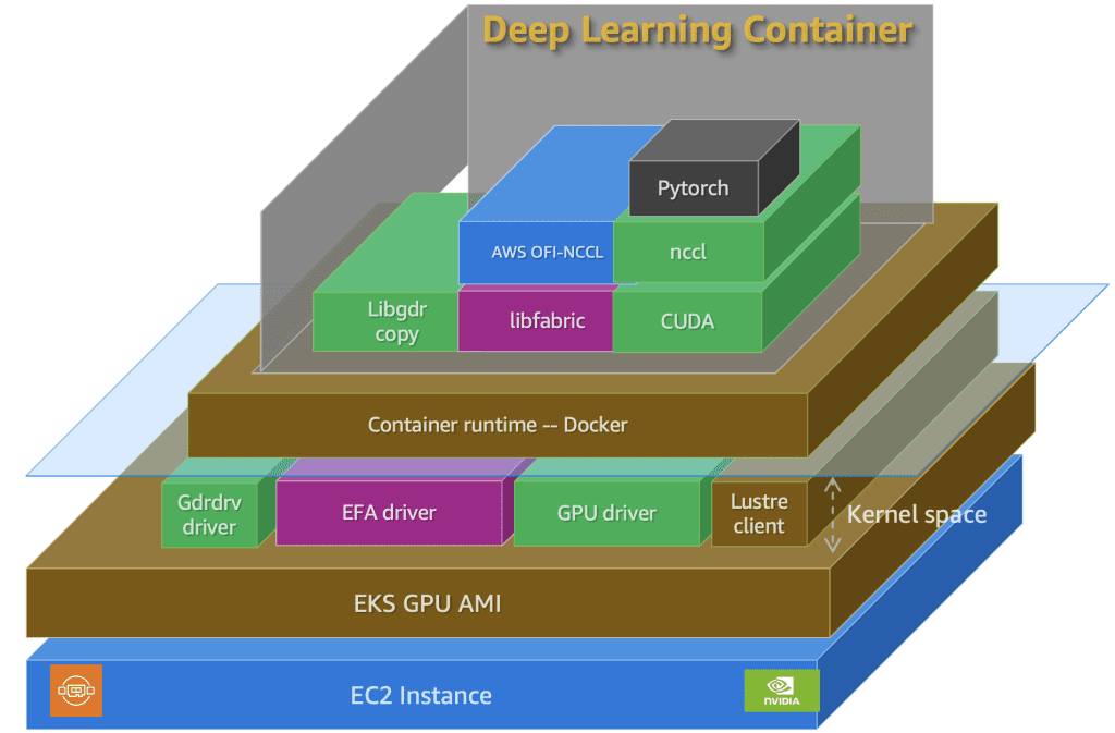 DLCs are pre-built, performance-optimized Docker images that make it straightforward to run popular frameworks like PyTorch and TensorFlow on AWS. Each DLC ships with a fully integrated stack that includes compatible versions of CUDA, cuDNN, and NCCL, plus optional EFA support for high-throughput, low-latency distributed training. These containers are validated across Amazon EC2, Amazon Elastic Container Service (Amazon ECS), and Amazon EKS, providing consistent performance on G- and P-family GPU instances. This uniform environment is critical for distributed workloads, where even minor version mismatches can trigger throughput degradation, stalled all-reduce operations, or CUDA/NCCL errors. Although it’s possible to build training containers from scratch, doing so at production scale is tedious: GPU drivers, CUDA, NCCL, and networking libraries must be aligned with strict version and hardware requirements. DLCs simplify this by providing secure, regularly updated images that are already optimized for AWS infrastructure.
