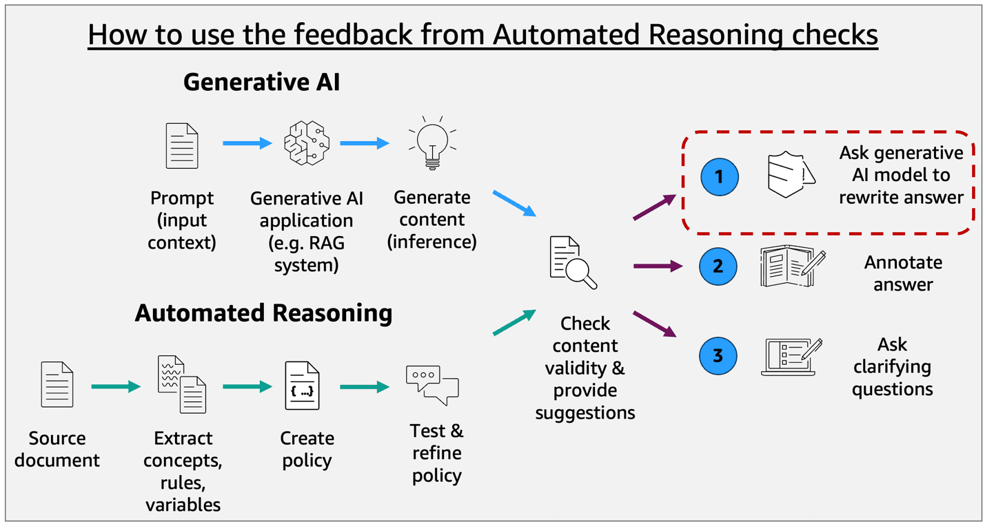 Automated Reasoning checks provide detailed, auditable findings that explain why a response failed validation, to support an iterative refinement process instead of simply blocking non-compliant content. This information can be fed back to your foundation model, allowing it to adjust responses based on specific feedback until they comply with policy rules. This approach is particularly valuable in regulated industries where factual accuracy and compliance must be mathematically verified rather than estimated.