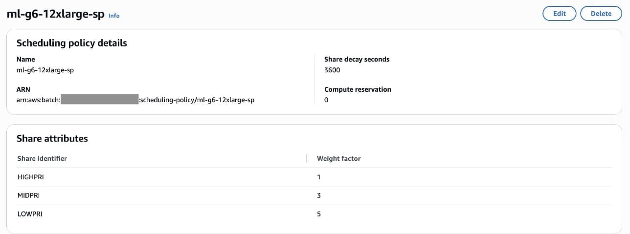 The associated scheduling policy for the queue ml-g6-12xlarge-queue is with share attributes such as High priority (HIGHPRI), Medium priority (MIDPRI) and Low priority (LOWPRI) along with the queue weights. Users can submit jobs and assign them to one of three shares: HIGHPRI, MIDPRI, or LOWPRI and assign weights such as 1 for high priority and 3 for medium and 5 for low priority. Below is the screenshot showing the scheduling policy details: