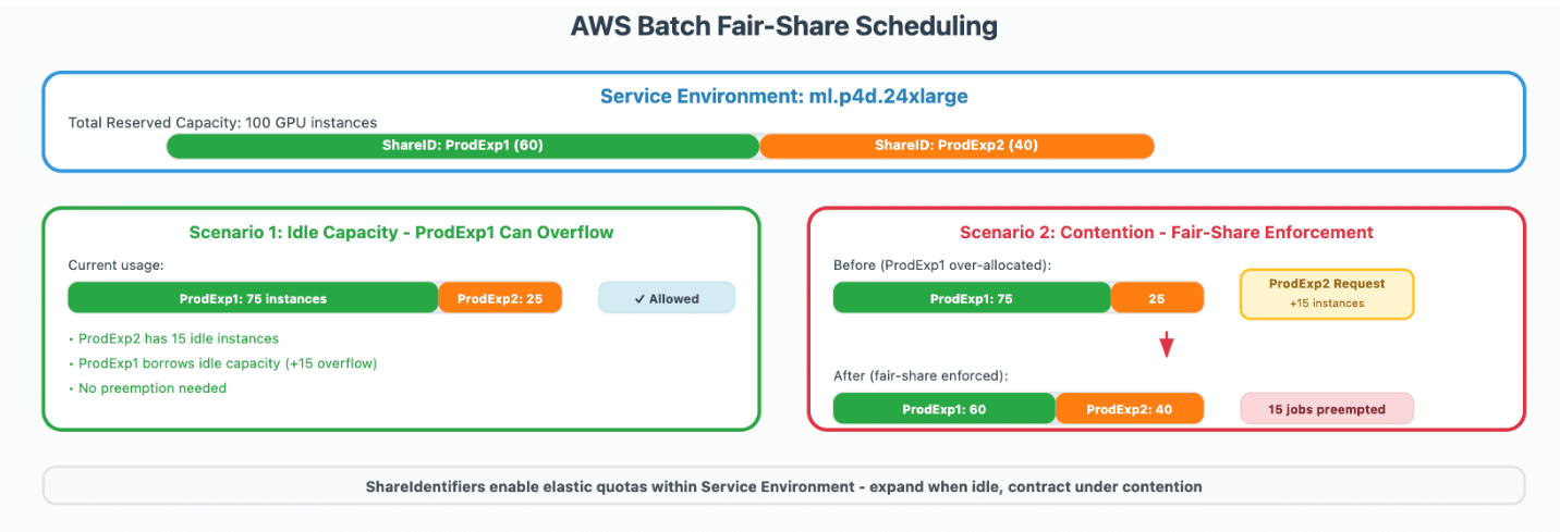 Figure 1 provides a real-world example of how we used AWS Batch’s fair-share scheduling to divide 100 GPU instance between ShareIDs. We allocated 60 instances to ProdExp1, and 40 to ProdExp2. When ProdExp2 used only 25 GPU instances, the remaining 15 could be borrowed by ProdExp1, allowing it to scale up to 75 GPU instances. When ProdExp2 later needed its full 40 GPU instances, the scheduler preempted jobs from ProdExp1 to restore balance. This example used the P4 instance family, but the same approach could apply to any SageMaker-supported EC2 instance family. This ensured that production workloads have guaranteed access to their assigned capacity, while exploratory or ad-hoc experiments could still make use of any idle GPU instances. This design safeguarded critical workloads and improved overall instance utilization by ensuring that no reserved capacity went unused.