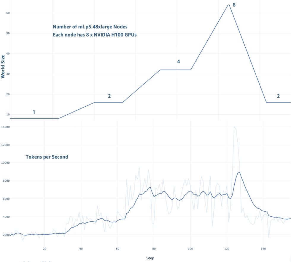 We evaluated elastic training across two key dimensions: training throughput and model convergence during scaling transitions. We observed a consistent improvement in throughput at different scaling configurations from 1 node to 8 nodes, as shown in the following figures. Training performance improved from 2,000 tokens/second at 1 node, and up to 14,000 tokens/second at 8 nodes. Throughout the training run, the loss continued decrease as model training continued to converge.