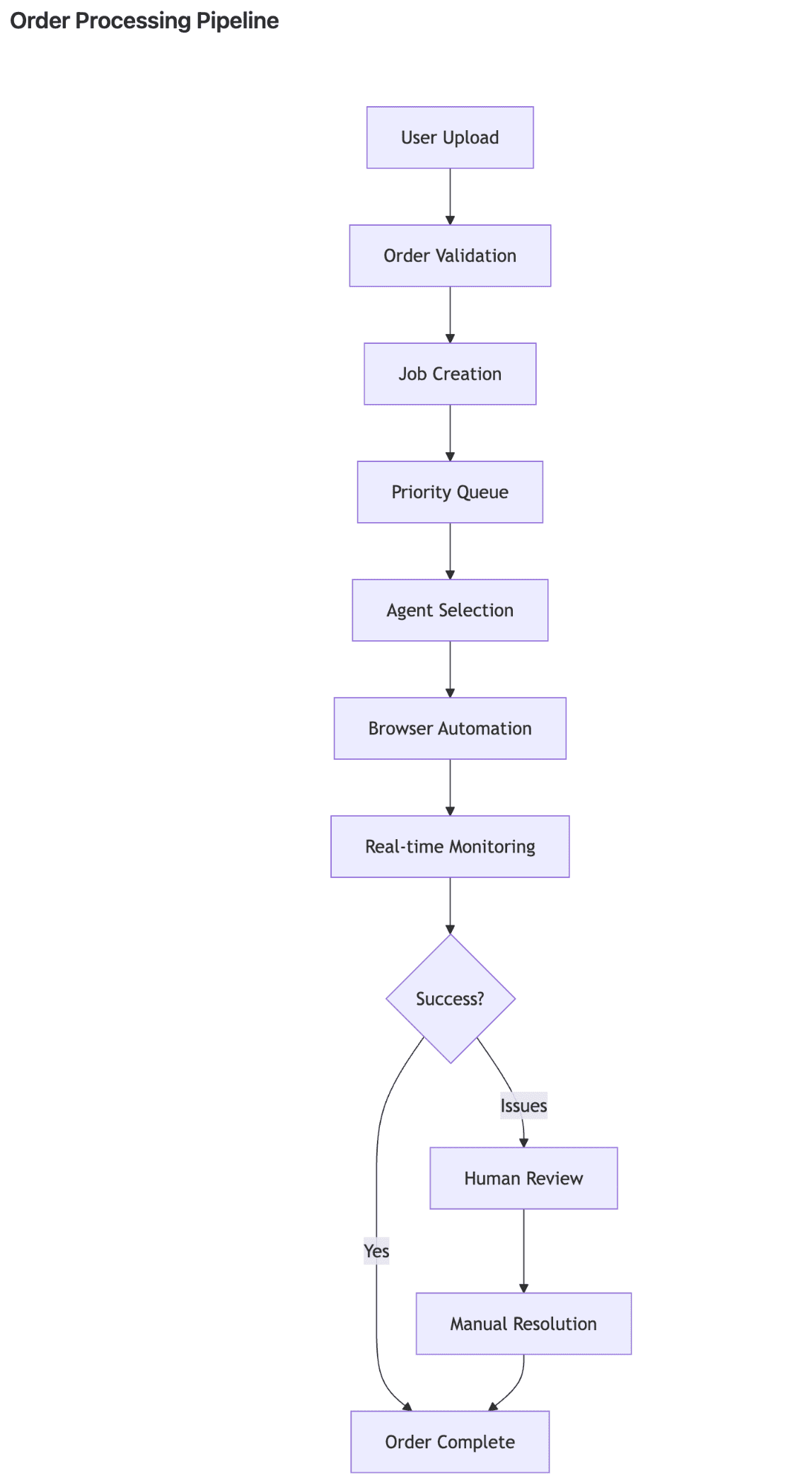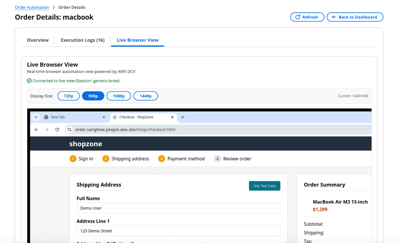 Throughout execution, the system captures session recordings stored in S3, screenshots at critical steps, and detailed execution logs with timestamps. Operators monitor progress through a real-time dashboard showing order status, current step, and progress percentage. For high-volume scenarios, batch processing supports parallel execution of multiple orders with configurable workers (1-10), priority-based queuing, and automatic retry logic for transient failures.