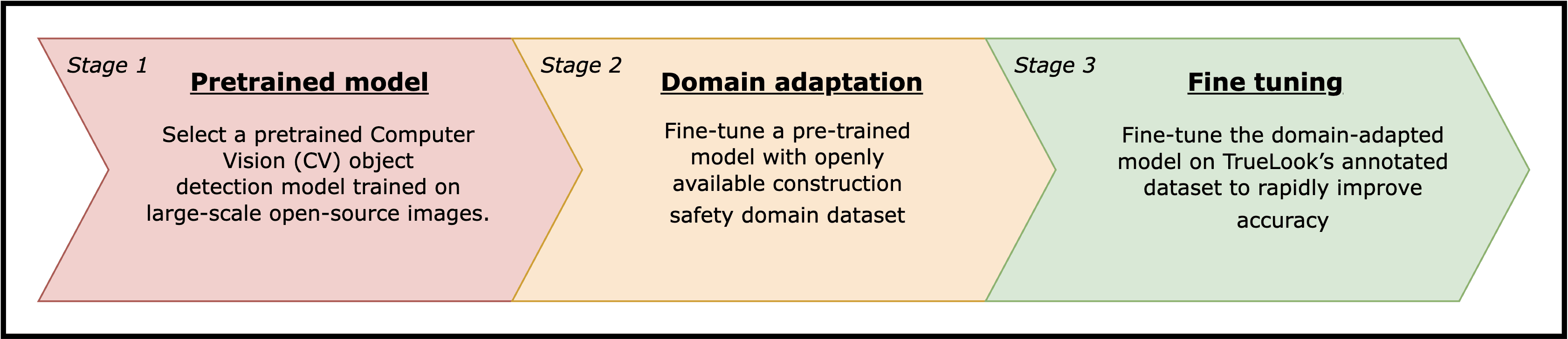 Early experimentation with low-code and no-code approaches revealed the need to domain-shift a pre-trained, open-domain object detection model—originally trained to recognize generic objects such as vehicles, people, and animals—into the construction and safety domain. This initial domain adaptation enables the model to learn construction-specific visual concepts, including safety equipment and worker presence in complex job-site conditions such as partial occlusion, using curated open-source construction datasets. This domain-shifted object detection model is then further fine-tuned on customer-specific datasets to align the model’s target classes with each customer’s labeling standards and site conditions. The following diagram illustrates this progression as a three-stage training workflow.