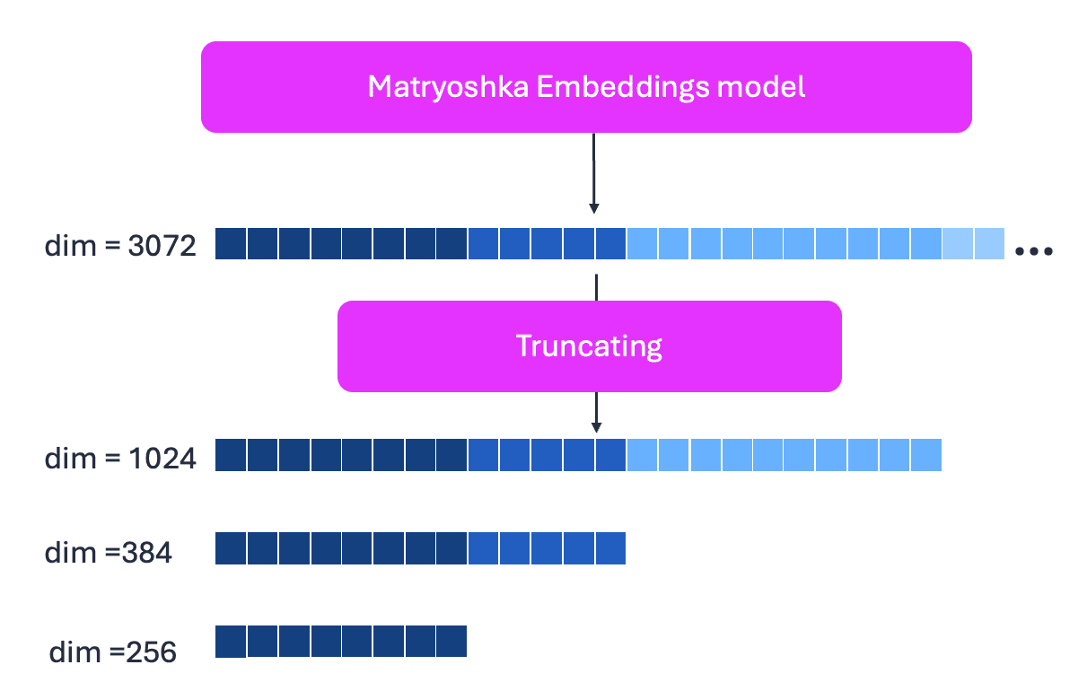 The Amazon Nova Multimodal Embeddings model uses Matryoshka representation learning, supporting multiple embedding dimensions: 3072, 1024, 384, and 256. Matryoshka embedding learning stores the most important information in the first dimensions and less critical details in later dimensions. You can truncate from the end (shown in the following figure) to reduce storage space while maintaining accuracy for your specific use case.