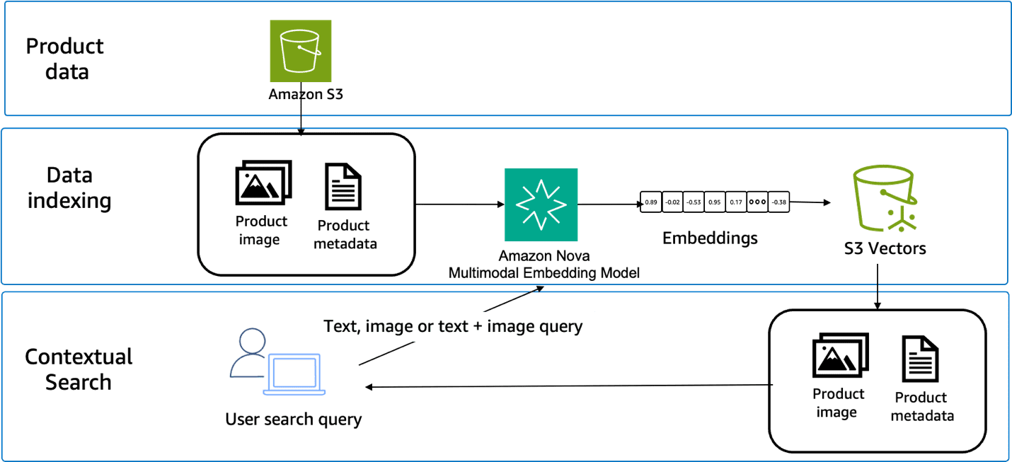Amazon Nova handles different types of search queries through the same model, which creates both new search capabilities and technical advantages. Whether you upload images, enter descriptions using text, or combine both, the process works the same way.