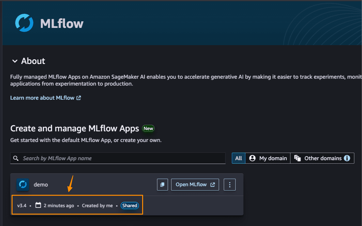 Amazon SageMaker AI now offers a serverless MLflow capability that removes this complexity. You can begin tracking, comparing, and evaluating experiments without waiting for infrastructure setup. MLflow scales dynamically to deliver fast performance for demanding and unpredictable model development tasks, then scales down during idle time. The following screenshot shows the MLFlow application in the SageMaker AI UI.