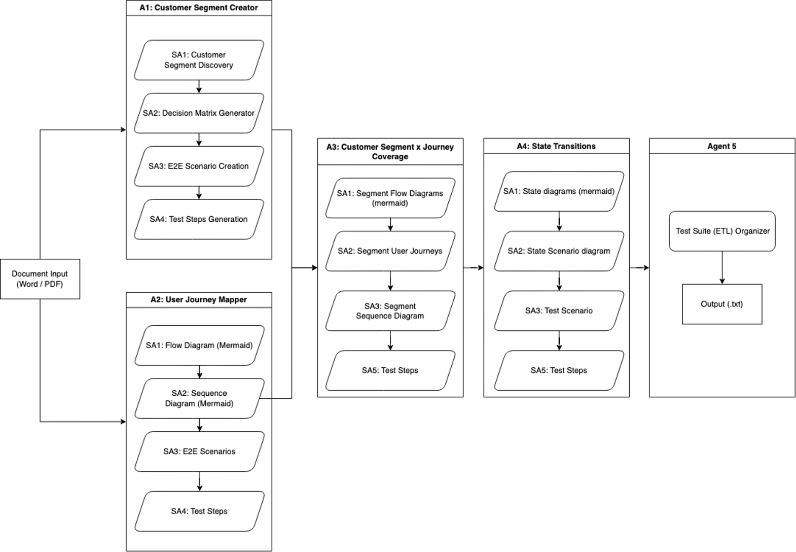 This systematic approach facilitates comprehensive coverage of customer journeys, segments, and various diagram types, enabling thorough test coverage generation through iterative processing by agents and subagents.