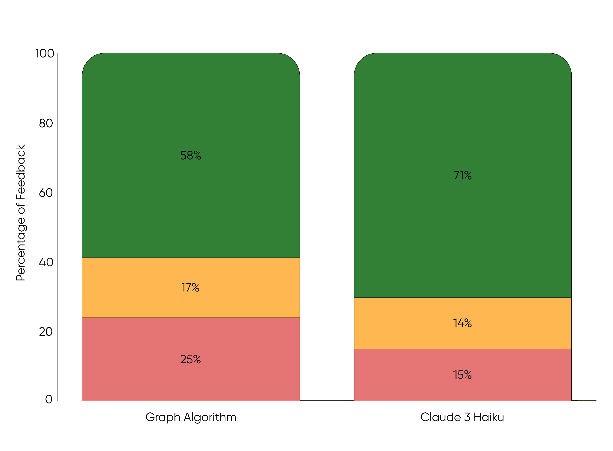 By moving from the Graph Algorithm to Claude 3 Haiku for generating title suggestions, we increased positive user feedback by 13% (from 58% to 71%).