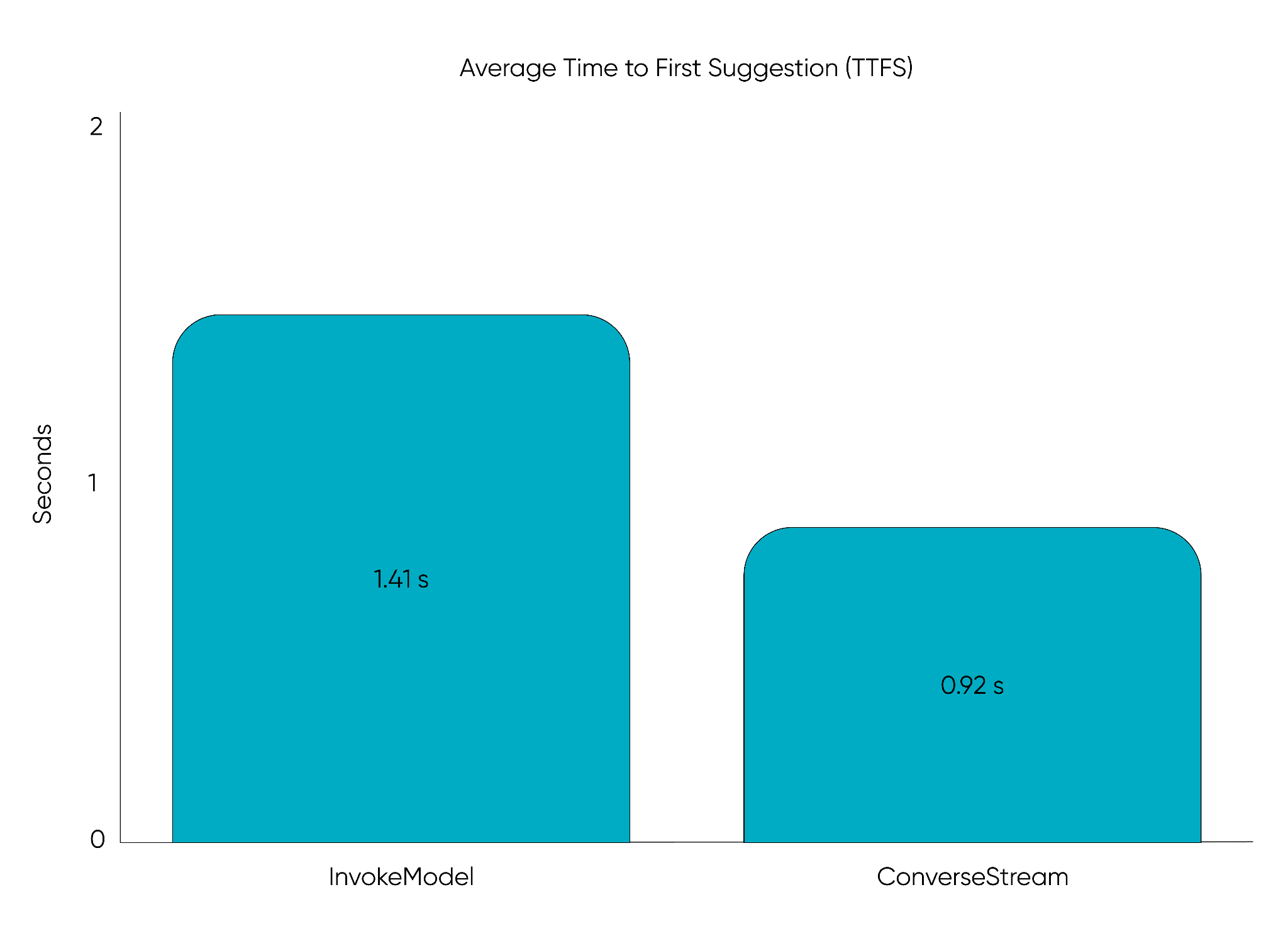 By migrating to the ConverseStream API, we reduced the average time to first suggestion from 1.41 seconds to 0.92 seconds, delivering title suggestions 35% faster to users.